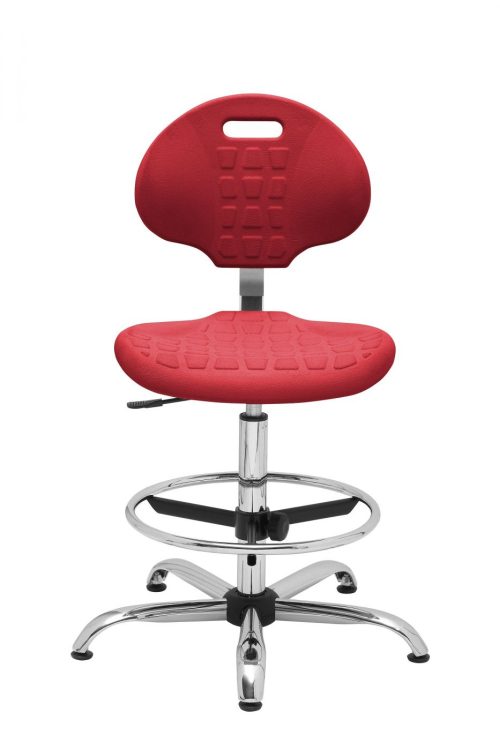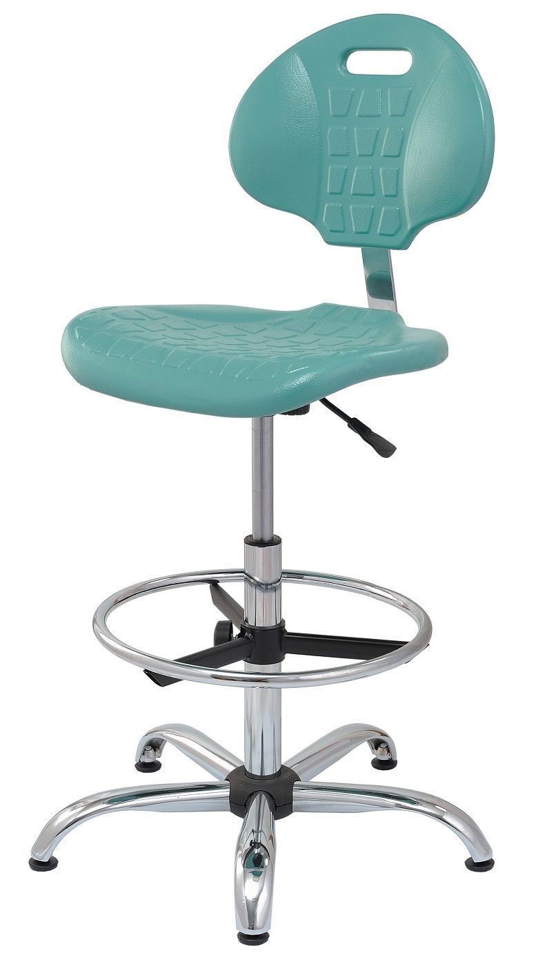 Konstrukcja siedziska i oparcia wykonana z anatomicznie wyprofilowanej sklejki oblanej czarną lub kolorową pianką PU, co sprawia że krzesła są wygodne, łatwe w utrzymaniu czystości, odporne na ścieranie i działanie środków czyszczących. Siedzisko osadzone na wysokiej kolumnie gazowej, która za pośrednictwem dźwigni pozwala na płynną regulację wysokości, dzięki zastosowaniu mechanizmu CPT krzesło można dopasować do potrzeb użytkownika. Do kolumny dołączony jest podnóżek z regulowaną wysokością montażu, podnóżek w kształcie chromowanego ringu pozwala osobom siedzącym oprzeć nogi. Podstawa pięcioramienna – chromowany metal, posadowiona na stopkach.